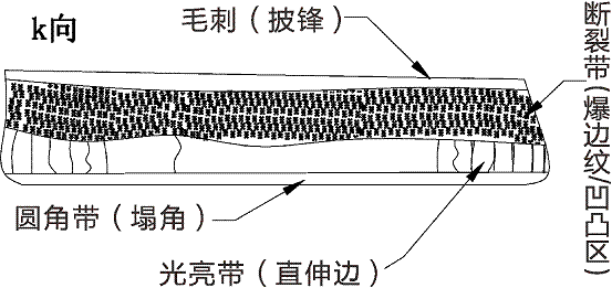 斷裂帶產生于沖裁變形第3階段,由于拉應力的作用促使裂紋不斷擴展,金屬纖維拉斷,生成表面粗糙無光澤且有斜度的斷裂帶。